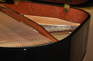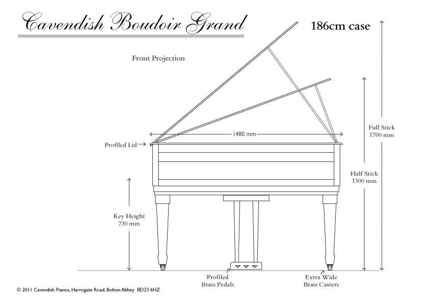 The Cavendish Boudoir Performance edition grand piano offers a larger soundboard in comparison to other pianos of the same length, due to its innovative “wide tail” design. This wider construction of the case means that a 186 grand has the same soundboard area as a typical 196 grand piano, creating the power, complexity and character of sound, as well as the feel of playing a much larger piano.