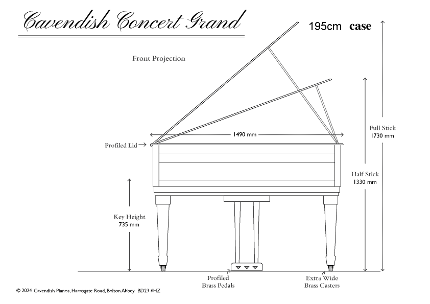 The Cavendish Concert Grand is the culmination of many years of research. We wanted to produce a piano of effortless power and presence to fill a large space with sound combined with a warmth of tone and mellow clarity of the famous English piano makers of the past. This was achieved by using the highest quality components available. Using tone wood (high altitude slow-grown spruce) not just for the soundboard but for the whole acoustic body (soundboard ribs, backposts and apron). This allows the whole assembly to “sing” producing unparalleled power. Coupled with the maple bridges, Renner action and Klüge keyboard a subtlety of tone is achieved which brings back to life the historic greatness of the English piano tone of yesteryear.
