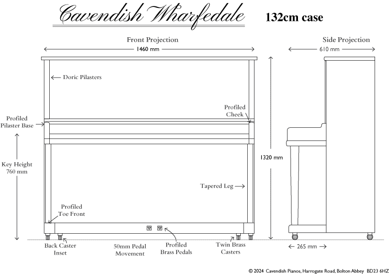 The Wharfedale was conceived to be the ultimate upright piano. It is often considered that an upright is in some way inferior to a grand piano. However, if an upright is expertly and lovingly constructed from the most superior materials available and of sufficient size it can be an equal to even its most prestigious medium-sized grand piano counterparts.